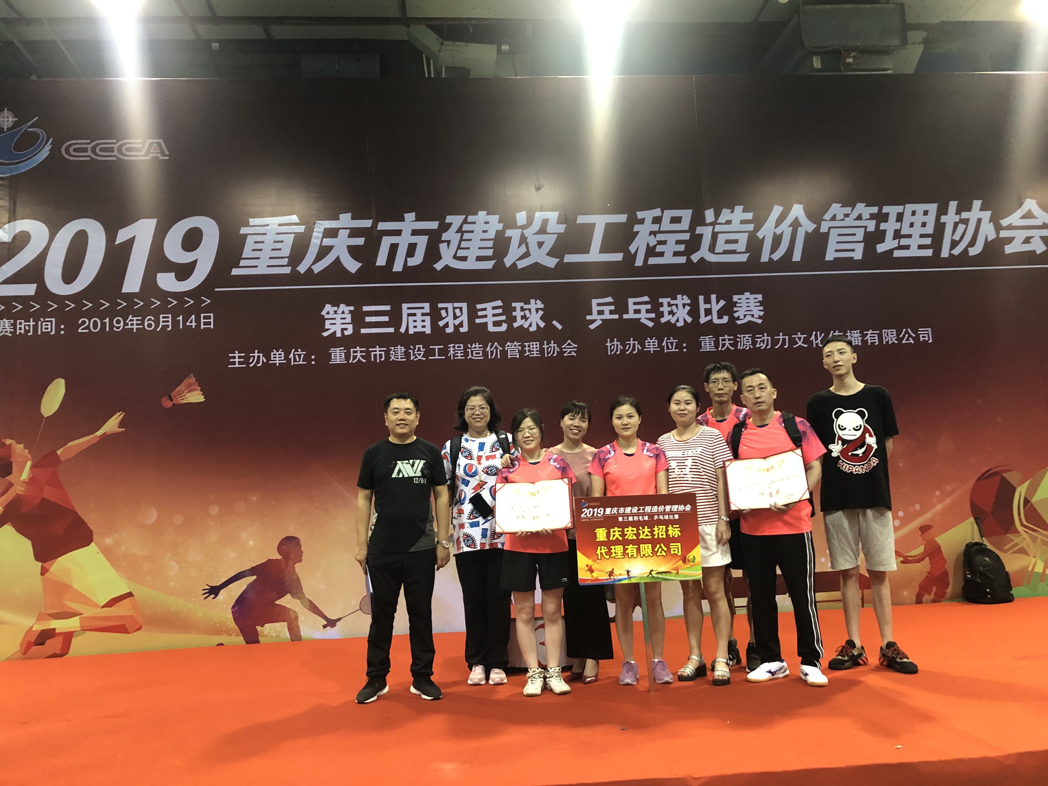 ——記重慶市建設工程造價管理協會第三屆羽毛球、乒乓球比賽 重慶市建設工程造價管理協會舉辦的第三屆羽毛球、乒乓球比賽于2019年6月14日在大田灣體育場隆重舉行。此次賽事得到了廣大會員單位的熱情響應和積極支持,共83支隊伍近300名選手參加了本次比賽。 重慶宏達招標代理有限公司員工參賽熱情高漲,積極報名參加,公司為這次活動提供了優越的后勤保障,啦啦隊全程為參賽選手加油鼓勁,表現了良好的拼搏進取和團結協作的精神。 公司的五名參賽選手分別參加了羽毛球男子單打、羽毛球男女混雙、乒乓球男單、乒乓球女單等四個項目的比賽。宏達公司在比賽中積極發揚了“友誼第一、比賽第二、重在參與”的良好體育道德精神。最終取得了不俗成績:李宏剛斬獲乒乓球男單第四名;李彬榮獲體育道德風尚獎。 本次比賽展示了我公司齊心合力、眾志成城、勇攀高峰的團隊合作力量;展現了造價行業人員之間積極進取、拼搏向上、勇于開拓的精神。增強了我市造價行業人員之間的凝聚力及和諧氛圍。