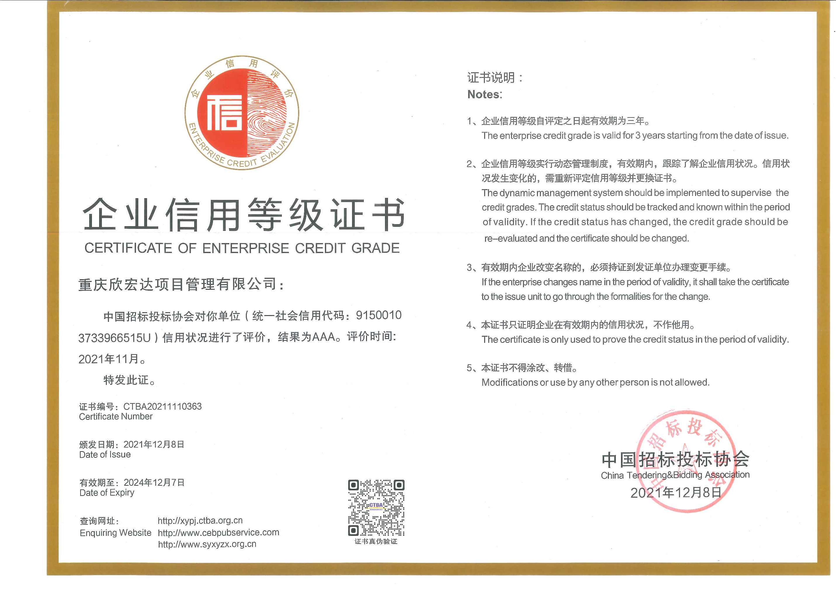 2021年12月8日,中國招標投標協(xié)會發(fā)布《中國招標投標協(xié)會招標代理機構2021年信用評價結果公告》,重慶欣宏達項目管理有限公司榜上有名,獲得首次由中招協(xié)委托的第三方獨立信用評價服務機構評價的招標代理機構企業(yè)信用3A級證書。這是國家行業(yè)協(xié)會對重慶欣宏達公司誠信經營的高度認可,同時也彰顯了欣宏達公司的綜合實力。 根據(jù)《中國招標投標行業(yè)信用評價管理辦法(試行)》,中國招標投標行業(yè)信用評價等級共分“三等九級”,等級標準分為A、B、C三等五級,下設AAA、AA、A、BBB、CCC,每個等級均對應相應的信用狀況。AAA級是信用級別最高的等級。 中國招標投標行業(yè)協(xié)會對招標代理機構的信用評價從“企業(yè)基本信息、經營管理信息、財務狀況信息、公共信用信息、行業(yè)評價”五部分進行綜合評價。企業(yè)基本信息由注冊信息、關聯(lián)關系、黨的組織建設、變更信息組成;經營管理信息由人力資源信息、內部控制管理體系、經營規(guī)模、履約情況、信息化能力、拓展能力組成;財務狀況信息由盈利能力、償債能力、營運能力、成長能力組成;公共信用信息由榮譽獎勵、市場監(jiān)管信息、經營合規(guī)、稅務信息、司法信息、輿情信息組成、行業(yè)評價由業(yè)主評價、協(xié)會評價組成。招標代理機構信用評價指標由5項一級指標、21項二級指標和48項三級指標構成,按百分制分別賦予不同權重,按得分高低劃分評價等級。 中國招標投標協(xié)會于2021年10月12日發(fā)布了《關于在招標代理機構會員企業(yè)中開展中國招標投標行業(yè)信用評價試點工作的通知》,參評企業(yè)申報材料截止時間為10月31日,協(xié)會按《中國招標投標行業(yè)信用評價管理辦法》、《招標代理機構信用評價指標標準》組織第三方信用評價機構對參評企業(yè)申報材料進行評價,全國共有450家代理機構獲AAA級,30家企業(yè)獲AA級。證書有效期三年。 2022年1月4日