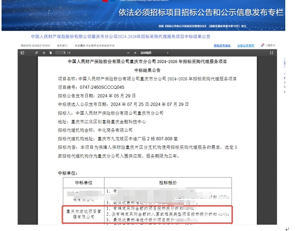 近期,重慶欣宏達項目管理有限公司(以下簡稱“欣宏達”)憑借雄厚企業實力,成功中標“中國光大銀行股份有限公司重慶分行2025年—2027年招標代理機構入圍項目”,繼續與光大銀行重慶分行攜手合作,為其提供優質高效的招標采購服務。 欣宏達已連續多年為光大銀行重慶分行提供服務,嚴格遵守國家法律法規及行業規范,認真履行合同相關約定,致力于為客戶提供專業、優質、高效、合規的招標采購代理咨詢服務,獲得客戶高度評價。 ![]() 近年來,欣宏達深耕金融領域招標采購市場,持續提升專業能力和服務水平,積累豐富經驗,已成功為包括中國工商銀行股份有限公司重慶分行、中國人民財產保險股份有限公司重慶市分公司、中國人壽保險公司重慶市分公司在內的多家央企金融機構提供年度框架招標采購代理服務,還即將為某一地區性商業銀行提供服務。欣宏達深入了解金融行業招標采購需求特點,熟悉各類型項目招標采購要點,從采購政策研究、業務咨詢溝通、招標采購風險控制等方面強化支撐服務,統籌處理好風險管理、效益管理和效率管理,積極助力金融行業招標采購數字化、綠色化、標準化、陽光化、市場化發展。 ?